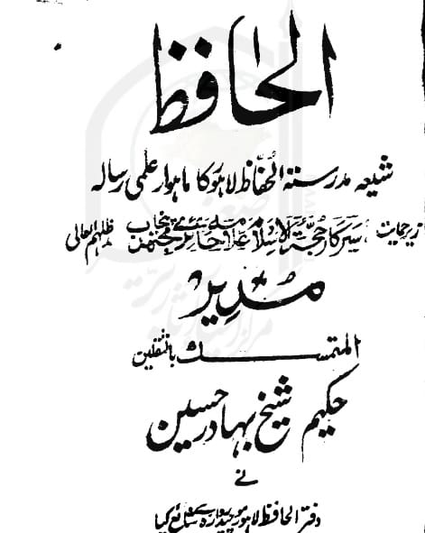 - نام کتاب: رسالہ الحافظ ( جلد 01نمبر03) شوال 1343ہجری ۔ زیر حمایت : آیت اللہ مفسر قرآن سید علی حائری رضوی لاہوری ۔ مدیر : حکیم شیخ بہادر حسین ۔ ناشر: دفتر الحافظ لاہور ۔ تاریخ نشر: ۔1343 ہجری۔ 1925عیسوی۔ زبان: اردو۔ موضوع:۔ رسائل و جرائد، ماہنامہ، رسائل، استفتات۔
