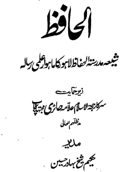 - نام کتاب: رسالہ الحافظ ( جلد 02نمبر01) شعبان 1344ہجری ۔ زیر حمایت : آیت اللہ مفسر قرآن سید علی حائری رضوی لاہوری ۔ مدیر : حکیم شیخ بہادر حسین ۔ ناشر: دفتر الحافظ لاہور ۔ تاریخ نشر: ۔1344 ہجری۔ 1925عیسوی۔ زبان: اردو۔ موضوع:۔ رسائل و جرائد، ماہنامہ، رسائل، استفتات۔