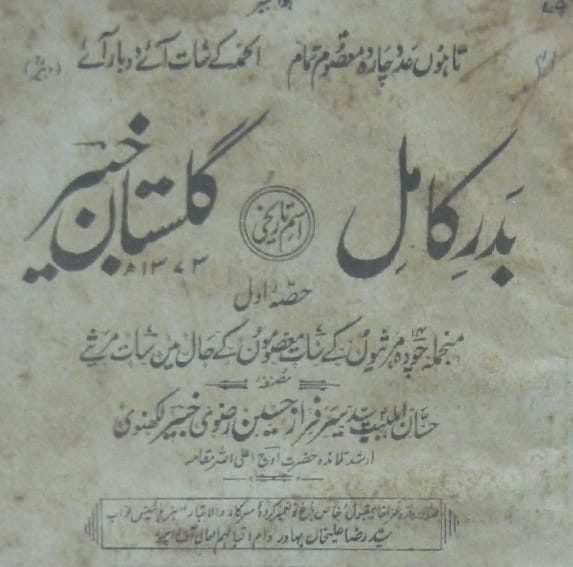 - نام کتاب: بدر کامل معروف گلستان خبیر (مجموعہ مرثیہ ) حصہ اول ۔ مؤلف : شاعر اہلبیت سید سرفراز حسین رضوی خبیر لکھنؤی ۔ ناشر: ممتاز بک ایجنسی نخاس لکھنؤ۔ تاریخ نشر: 1373 ہجری۔1954عیسوی ۔ زبان: اردو ۔ موضوع: مرثیہ، مجموعہ مرثیہ، مجموعہ کلام، مرثیہ نگاری، مصائب، عزاداری، بدر کامل معروف گلستان خبیر (مجموعہ مرثیہ ) حصہ اول۔