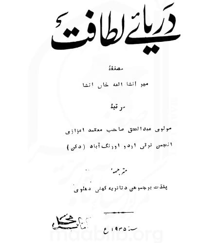 - نام کتاب:دریائے لطافت (مجموعہ کلام) ۔ مؤلف : میر انشا اللہ خان انشا ۔ مرتبہ: مولوی عبد الحق ۔ ناشر: انجمن ترقی اردو اورنگ آبا د دکن ۔ تاریخ نشر:1354 ہجری۔1935 عیسوی ۔ زبان: اردو ۔ موضوع: مجموعہ کلام، منظوم، نظم ، اشعار، مجموعہ اشعار، کلام، دریائے لطافت (مجموعہ کلام) ۔