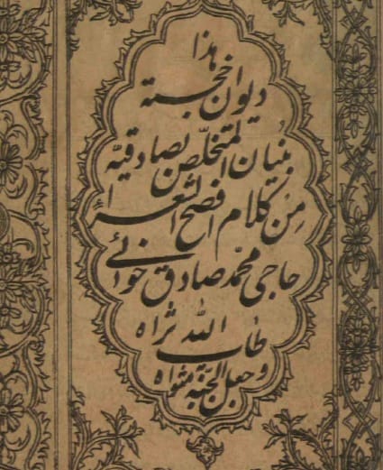 - نام کتاب:دیوان صادقیہ (مجموعہ کلام) ۔ مؤلف : حاجی محمد صادق خوئی ہندی ۔ ناشر: مطبع گلزار حسینی بمبئی ہند ۔ تاریخ نشر:1317 ہجری۔1899 عیسوی ۔ زبان: فارسی ۔ موضوع: مجموعہ کلام، منظوم، نظم ، اشعار، مجموعہ اشعار، کلام،دیوان صادقیہ (مجموعہ کلام) ۔