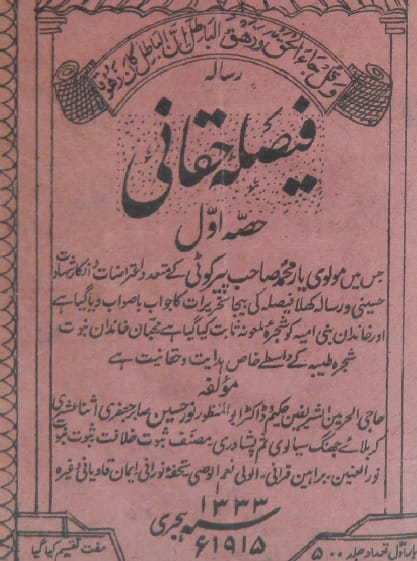 - نام کتاب: فیصلہ حقانی (حصہ اول) ۔ مؤلف : حکیم و ڈاکٹر نور حسین صابر جعفری ۔ ناشر: ۔ تاریخ نشر: ۔1333 ہجری۔1915عیسوی۔ زبان: اردو۔ موضوع:۔مناظرہ، الجواب، علم کلام،فیصلہ حقانی (حصہ اول) ۔