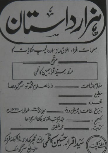 - نام کتاب: ہزار داستان(حکایات) ۔ مؤلف : مولانا سید اقرار حسین کاظمی (موضع مچھرکھادی)۔ ناشر: دارالعلوم محمدیہ سرگودھا۔ تاریخ نشر: ۔ 1422 ہجری۔ 2002عیسوی۔ زبان: اردو ۔ موضوع:۔ اخلاقیات ، اخلاقی اسباق، آداب زندگی، اخلاق ،حکایات، ،ہزار داستان(حکایات)۔
