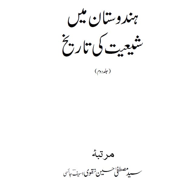 - نام کتاب:ہندوستان میں شیعیت کی تاریخ (جلد دوم) ۔ مؤلف : سید مصطفیٰ حسین نقوی اسیف جائسی مدیر ماہنامہ شعاع ۔ ناشر: ولایت پبلی کیشنز نئی دہلی ۔ تاریخ نشر: ۔ 1439ہجری۔2018 عیسوی۔ زبان: اردو۔ موضوع:۔ تاریخ، تاریخ شیعہ، تاریخ شیعہ برصغیر، تاریخ برصغیر ، ہندوستان میں شیعہ کی تاریخ،ہندوستان میں شیعیت کی تاریخ (جلد دوم) ۔