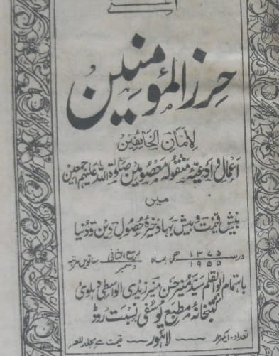 - نام کتاب:حرز المومنین لامان الخائفین (اعمال و ادعیہ منقولہ معصومینؑ) ۔ مؤلف : ابو قلم سید منیر حسن منیر زیدی واسطی دہلوی ۔ مترجم : سید ولی الحسن رضوی۔ ناشر: مطبع یوسفی نسبت روڈ لاہور ۔ تاریخ نشر: ۔1375 ہجری۔ 1955 عیسوی۔ زبان: اردو ۔ موضوع:۔ اعمال، ادعیہ، مجموعہ دعا، معصومینؑ کی دعائیں، اعمال ہر ماہ، ہر موقعہ کی دعا، حرز المومنین لامان الخائفین (اعمال و ادعیہ منقولہ معصومینؑ)۔
