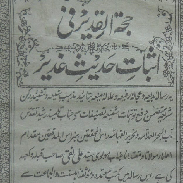 - نام کتاب:حجۃ القدیر فی اثبات حدیث غدیر ۔ مؤلف :مولانا سید علی نقی ۔ ناشر: مطبع یوسفی دہلی ۔ تاریخ نشر: ہجری۔ عیسوی ۔ زبان: اردو ۔ موضوع: مناظرہ، الجواب، علم کلام، حدیث غدیر، غدیر خم، اثبات ولایت جناب امیرؑ، حجۃ القدیر فی اثبات حدیث غدیر ۔
