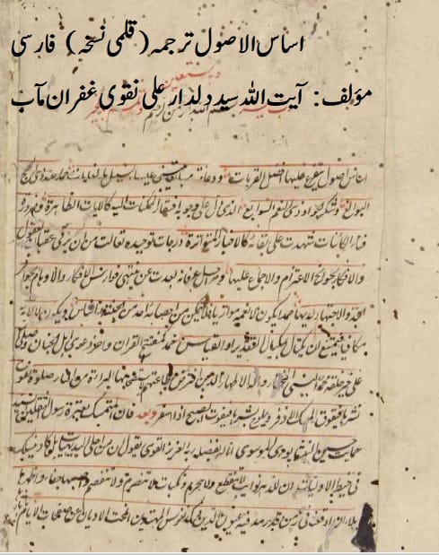 - نام کتاب:اساس الاصول (قلمی نسخہ ) ۔ مؤلف : آیت اللہ علامہ سید دلدار علی نقوی غفران مآب ۔ ناشر: ۔ تاریخ نشر: ہجری۔ عیسوی ۔ زبان: فارسی۔ موضوع: اصول فقہ شیعہ ، علم کلام، مناظرہ، رد اخباریت، رد فوائد المدنیہ استرآبادی،اساس الاصول (قلمی نسخہ ) ۔