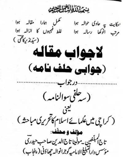 نام کتاب:لا جواب مقالہ(جوابی حلف نامہ) در جواب سہ حلفی سوالنامہ۔