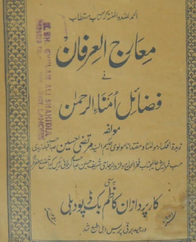 - نام کتاب:معارج العرفان فی فضائل امنا الرحمن ۔ مؤلف : حکیم سید مرتضی حسین زیدی ۔ ناشر: کاظم بک ڈپو دہلی ۔ تاریخ نشر: ۔1350 ہجری۔1932 عیسوی۔ زبان: اردو ۔ موضوع:۔ اصول دین، عقائد، مختصر عقائد ، علم کلام، معارج العرفان فی فضائل امنا الرحمن۔