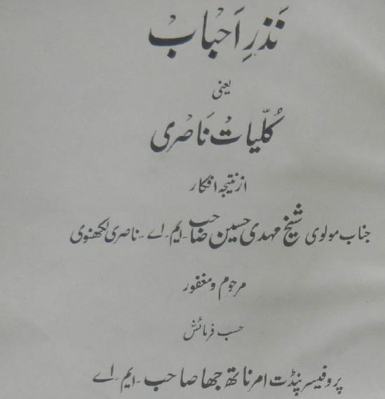 - نام کتاب:نذر احباب یعنی کلیات ناصری (مجموعہ کلام) ۔ مؤلف : مولوی شیخ مہدی حسین ناصری لکھنؤی۔ ناشر: انڈین پریس لمیٹڈ الہ آباد۔ تاریخ نشر:1352 ہجری۔1933 عیسوی ۔ زبان: اردو ۔ موضوع: مجموعہ کلام، منظوم، نظم ، اشعار، مجموعہ اشعار، کلام، نذر احباب یعنی کلیات ناصری (مجموعہ کلام) ۔