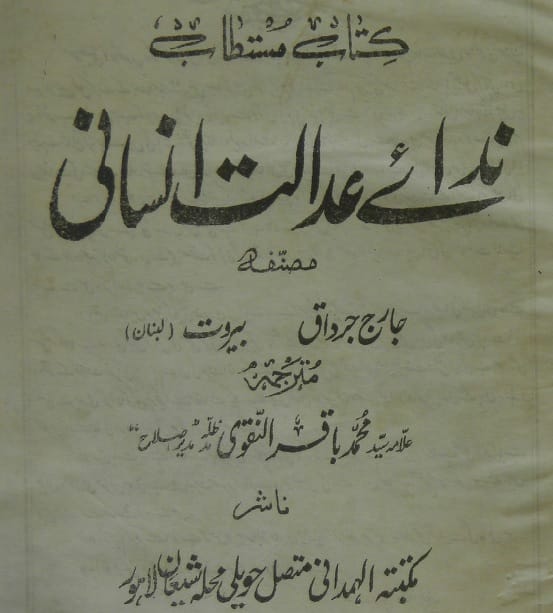 - نام کتاب:ندائے عدالت انسانی (قدیم چھاپ )۔ مؤلف : جارج جرداق بیروت لبنان ۔ مترجم : علامہ سید محمد باقر نقوی مد یر اصلاح ۔ ناشر: مکتبۃ الہمدانی متصل حویلی محلہ شیعان لاہور۔ تاریخ نشر: ۔ ہجری۔ عیسوی۔ زبان: اردو ۔ موضوع:۔سیرت امیر المومنینؑ، سیرت و حیات امام علیؑ، حیات طیبہ امام علیؑ، حیات علی ابن ابی طالبؑ، ترجمہ شدہ کتب، ندائے عدالت انسانی (قدیم چھاپ ) ۔