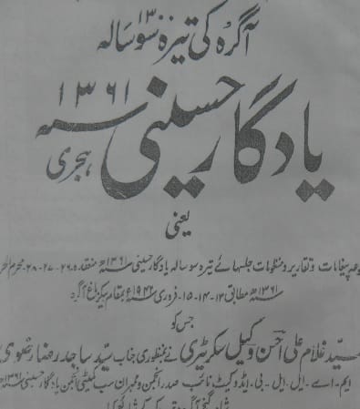 - نام کتاب: یاد گار حسینی 1361ہجری(تیرہ سو سالہ یادگار) ۔ ترتیب :سید غلام علی احسن وکیل ۔ ناشر: مطبوعہ آگرہ اخبار برقی پریس آگرہ ۔ تاریخ نشر:1361 ہجری۔1942عیسوی ۔ زبان: اردو۔ موضوع: رسائل و جرائد، مضامین، مقالات، تقاریر، جلسہ ، کربلا، امام حسینؑ، یاد گار حسینی 1361ہجری(تیرہ سو سالہ یادگار)